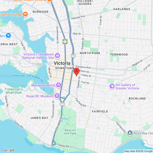 We are located in the heart of Downtown, between Quadra and Blanshard Streets, close to the one hour free parking View Street Parkade.